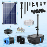 R : Le kit comprend un panneau solaire de 12 W, une pompe à eau sans balais de 160 GPH, un boîtier de filtration, des éponges filtrantes, des billes bio, des anneaux en biocéramique, 4 buses de pulvérisation et un tuyau de 2 m pour la création d'une cascade. Tous les composants sont prêts à l'emploi.