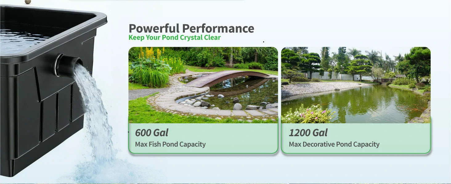 It is ideal for decorative ponds up to 1200 gallons or fish-stocked ponds (like Koi) up to 600 gallons to ensure clear and healthy water.
