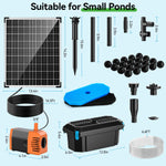R : Le forfait comprend : 1 panneau solaire de 30 W, 1 boîtier de filtre, 1 pompe de bassin de 320 GPH, 1 kit de fontaine avec buses et vanne de dérivation, 2 tampons filtrants, 10 boules filtrantes, 500 g d'anneaux en biocéramique, 1 tube en PVC de 6,5 pieds et 1 manuel d'utilisation.