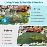 R : Le système utilise une combinaison de tampons filtrants, de bio-billes et d'ensembles de filtres pour éliminer les débris et réduire les algues, gardant l'eau de l'étang limpide et sans danger pour les poissons et les plantes.